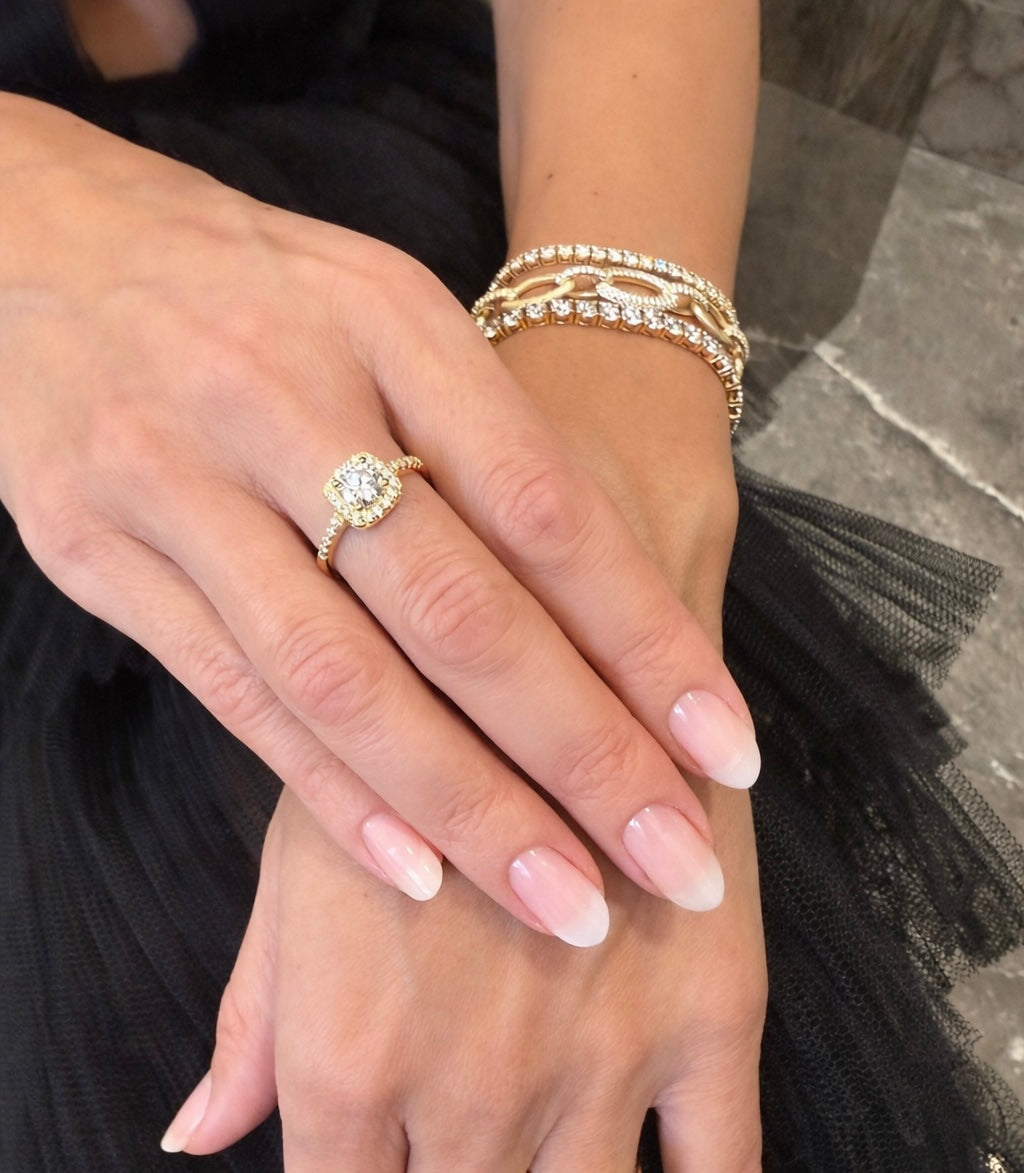 Lumina Halo Ring Golden Edt. er en elegant og tidløs ring med et varmt, klassisk udtryk. Designet kombinerer en strålende 1 carat lab moissanite i round brilliant cut med en firkantet halo af små sten, der fremhæver ringens form og forstærker dens samlede brilliance.