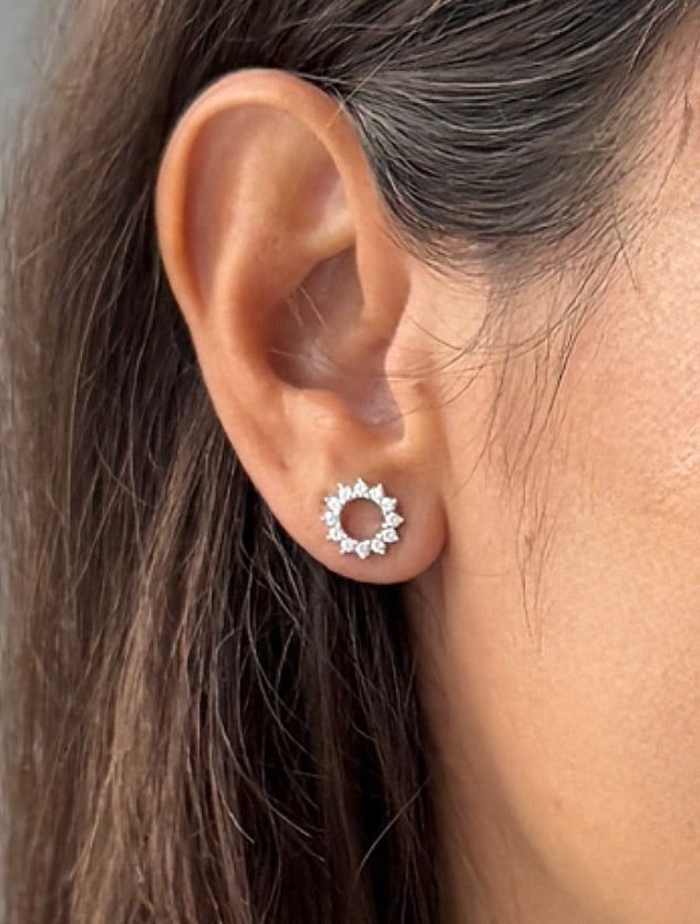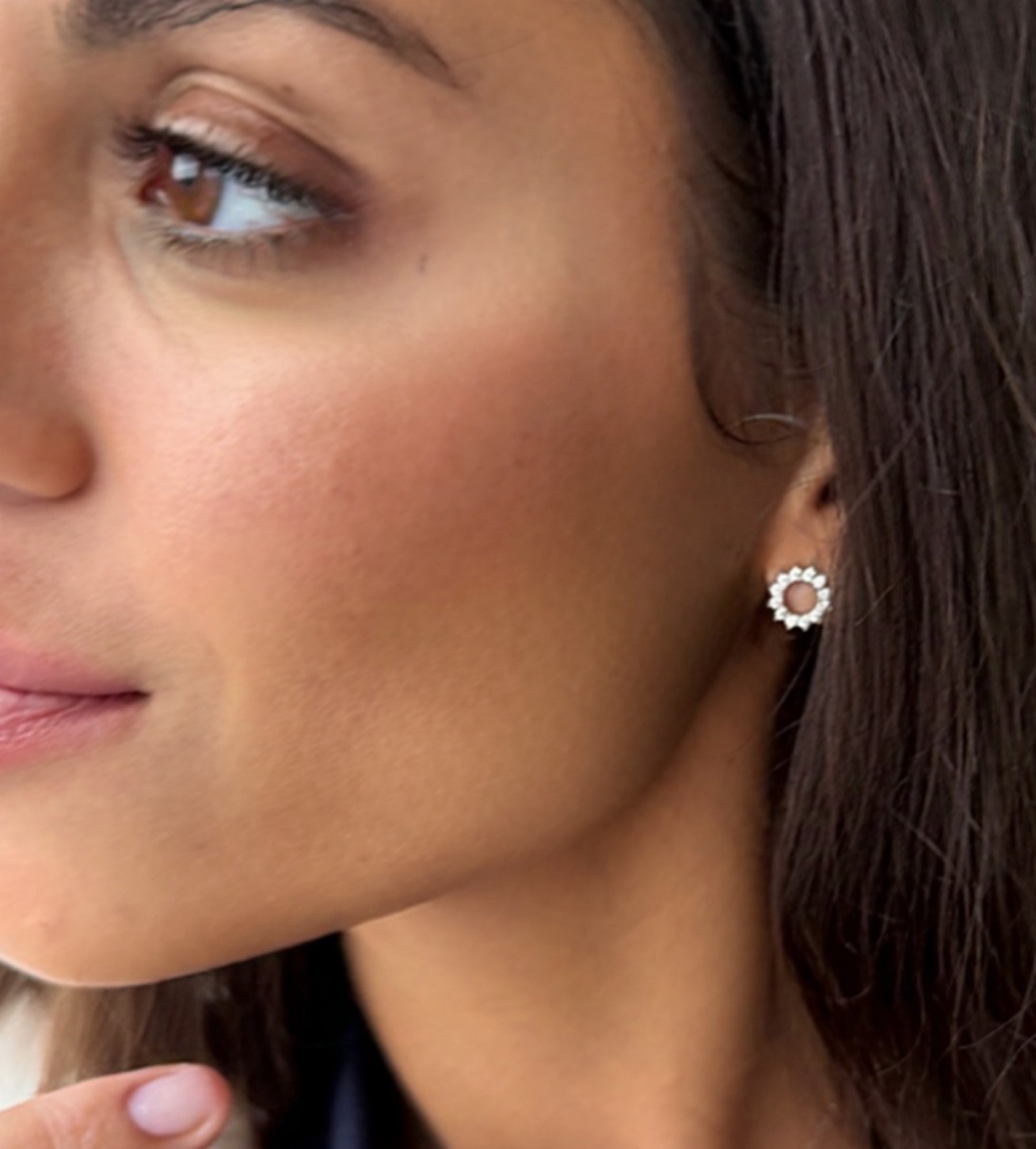 Flower Ørestikkerne er elegante halo-ørestikker i Sterling Sølv med 12 smukt placerede round brilliant cut moissanite-sten på hver ørestik – i alt 0.48 carat 💎