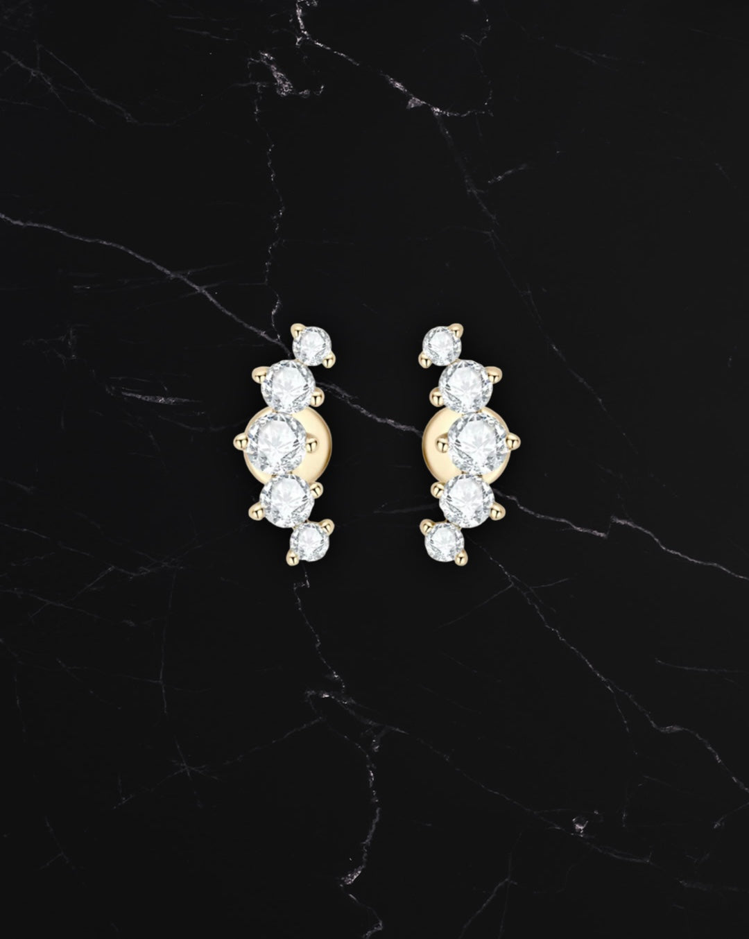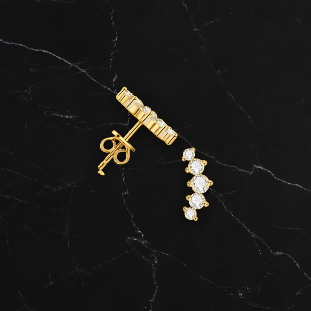 Hver ørestik er besat med 5 labgrown moissanite-sten i round brilliant cut. Den graduerede opbygning giver dybde, bevægelse og maksimal sparkle.