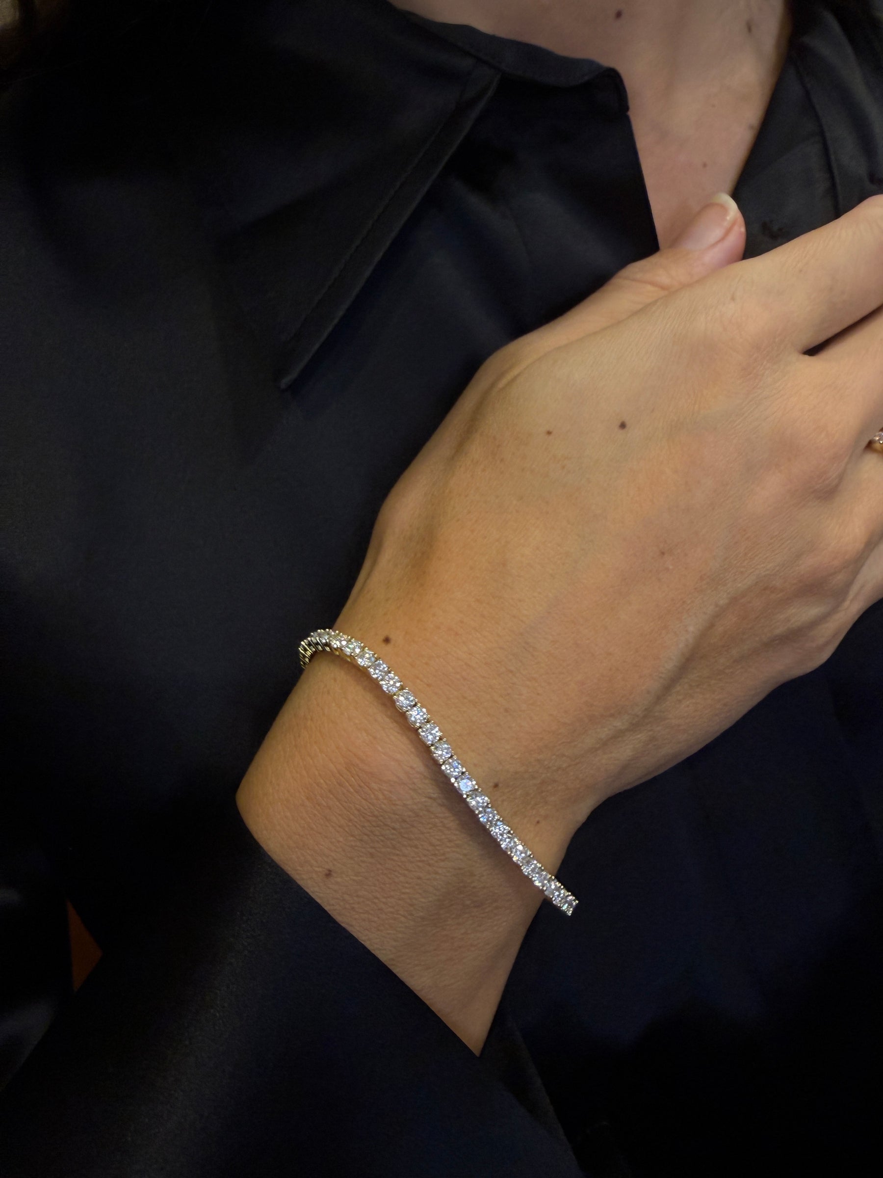 Bær CHR Tennis Armbånd 3 mm Golden Edt. alene for et rent og eksklusivt udtryk – eller kombinér det med et minimalistisk ur eller andre armbånd i guld for et personligt og moderne lag-på-lag-look. Match med moissanite-øreringe for et fuldendt ensemble til både hverdag og fest.
