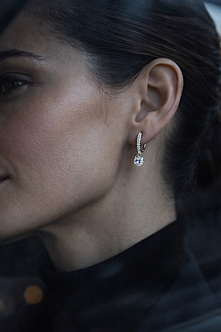 Hver ørering er prydet med en 0.5 carat round brilliant cut labgrown moissanite, nænsomt indfattet i fire grabber og ophængt i en slank pavébesat hoop. Det giver et eksklusivt og let udtryk, som reflekterer lyset smukt ved hver bevægelse.